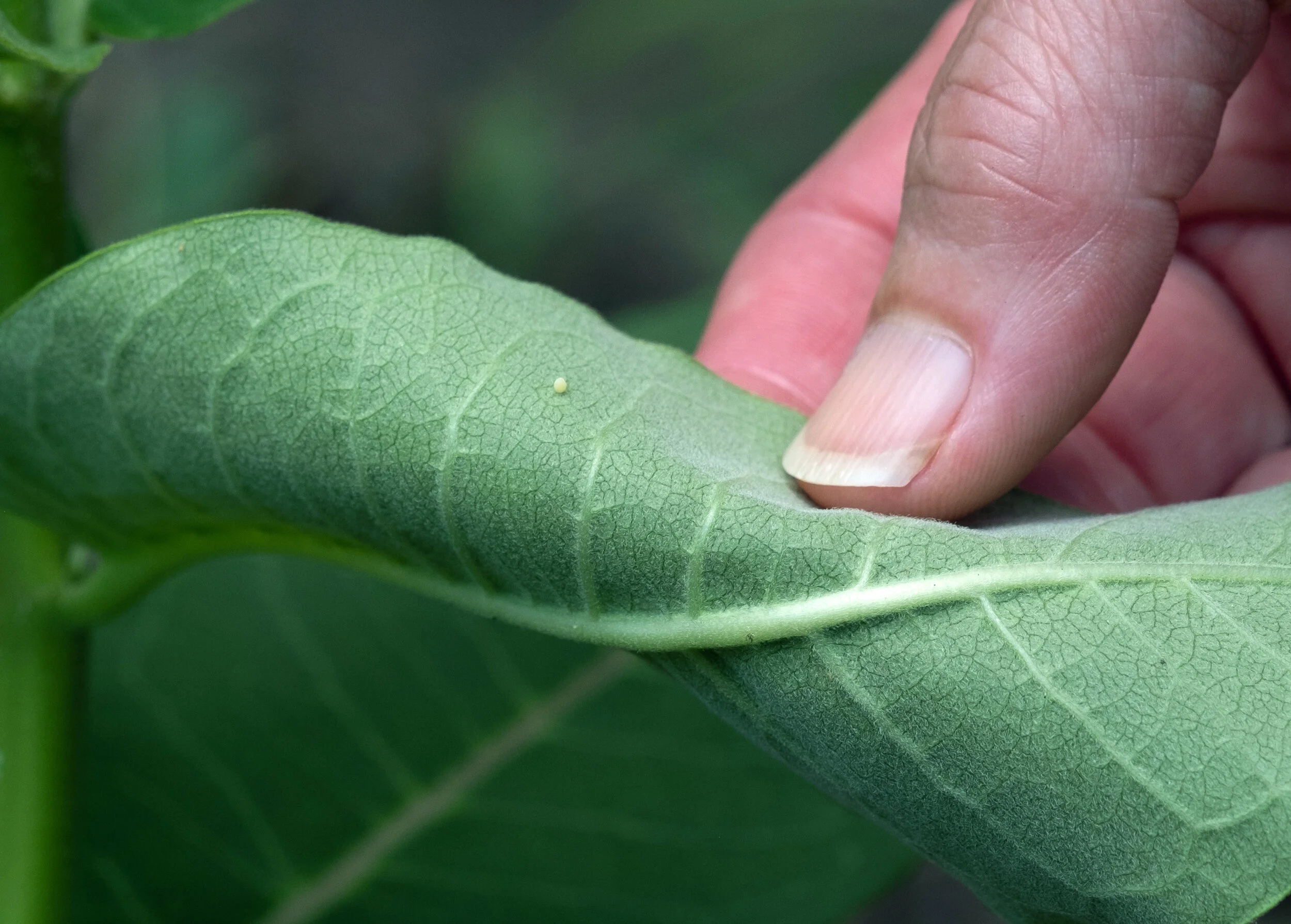 A Monarch egg laid on the back of a milkweed plant in early summer. Photo courtesy: MSU