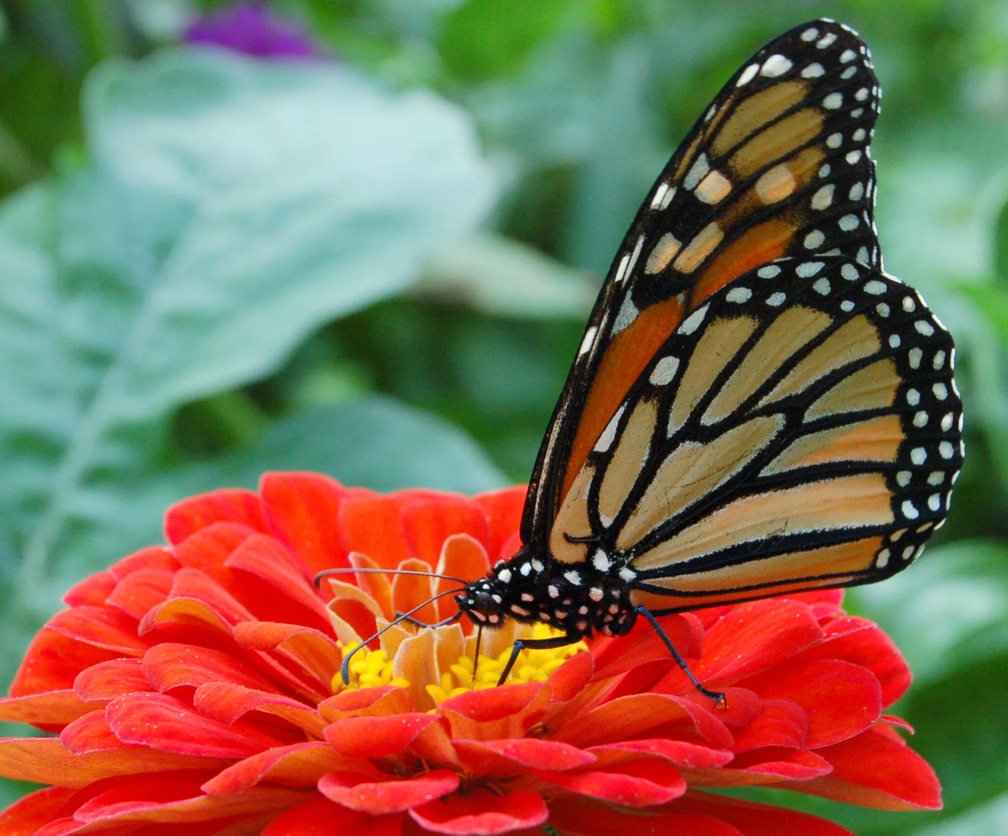 Monarch butterfly on a non-native Zinnia flower. Although the Zinnia alone is unable to support the completion of a Monarch’s lifecycle, it does provide sustenance in the form of nectar, which is necessary for the butterfly to complete their fall migration from Canada to Mexico.